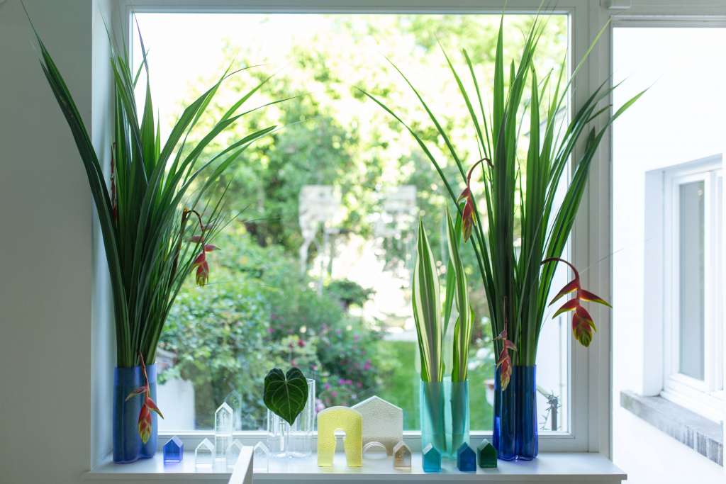 Garden View: another palette of colors with Lila Farget in dialogue with Samy Rio, Monozokuri, free blown glass into handmade bamboo moulds, light green and deep blue vases, unique pieces