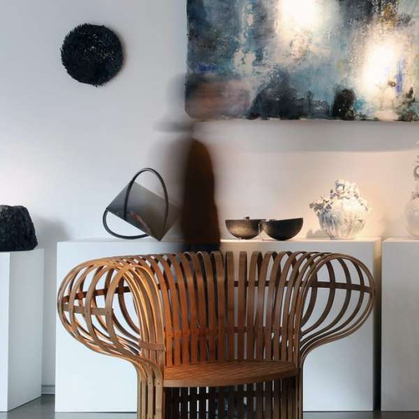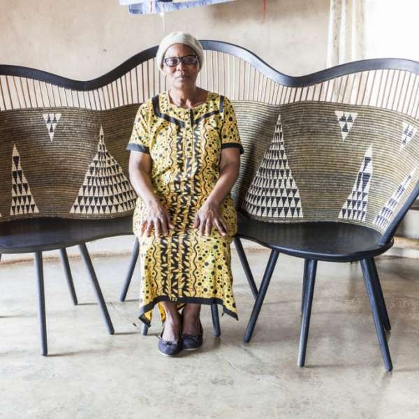 A contemporary bench by Beauty Ngxongo, with a backrest woven in the traditional Zulu style, brings an age-old South African craft into the 21st century.