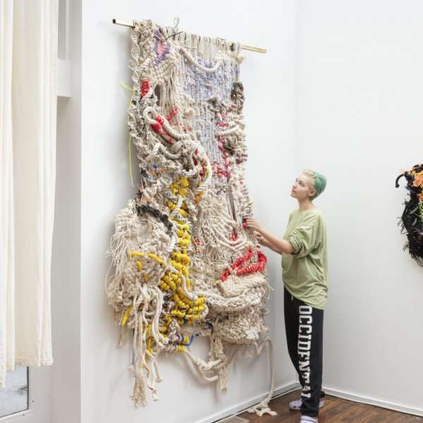 U.S. artist Jacqueline Surdell draws upon her background as an athlete and painter to create large-scale textile pieces that twist and expand beyond the confines of the frame.