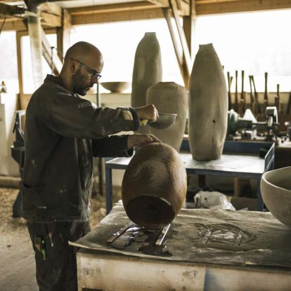 Ernst Gamperl creates large-scale wooden vessels, expertly crafting the material to reveal and express natural details and textures. In this careful and considered process, knots, bulges, splits, indentations, and scars are elevated,